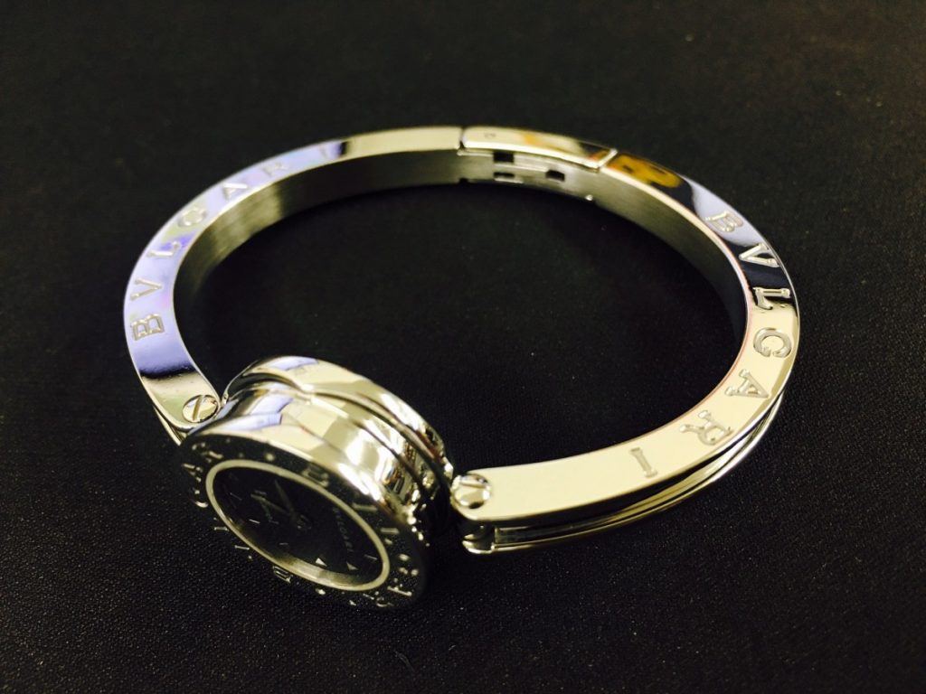 本日修理を完了しまして、工房窓口に帰ってきましたブルガリのお時計でございます。お預かり時は全体的に小傷が目立っておりましたが、今回研磨仕上げをご依頼頂きまして、外装がピカピカに仕上がっております。いかがでしょうか?