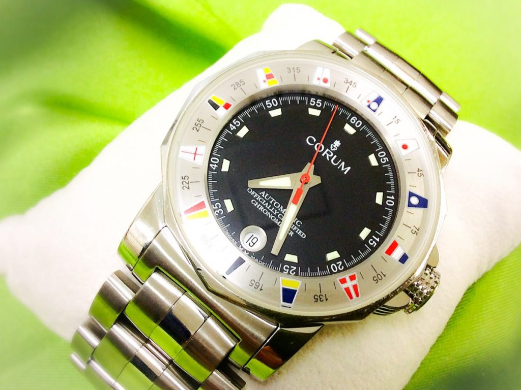 ご郵送にてお預かり致しましたのは、コルム社のアドミラルズカップ。世界的なレガッタレース「アドミラルカップ」に捧げるために作られたモデルでございます。裏蓋にはヨットのレリーフと、半分スケルトンで見えるローターにもカラフルな国旗がデザインされていて、細かいところにもこだわりが見えるお洒落で実用的なお時計でございます。