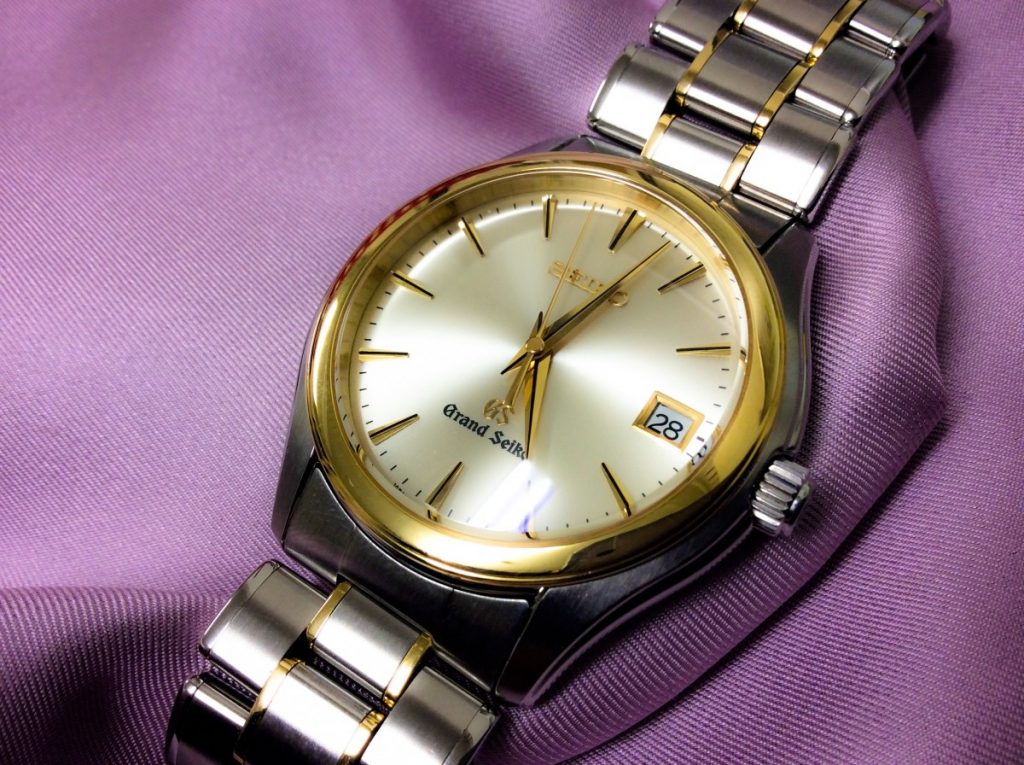 無料梱包パックにてお預かり致しましたのは、グランドセイコーのSBGX002。世界最高峰クォーツの9Fキャリバーが搭載されました、18金コンビネーションモデルでございます。