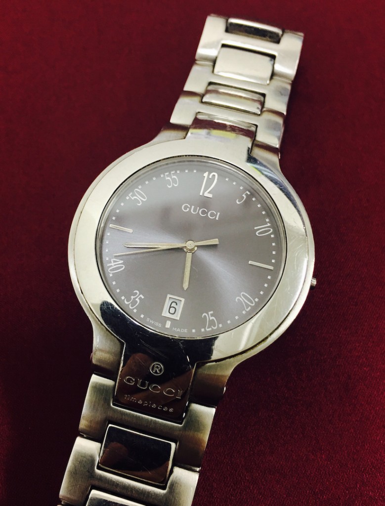 時計修理工房の奥平です。本日は朝から暖かいというより暑いと感じてしまいました。冬の装いはそろそろやめて、春の装いに変えたいと思うのですが、変えた途端にまた寒くなる気しかいたしません、正直今の時期の服装が一番難しいと感じております。本日は窓口にてお任せいただきました、グッチの腕時計をご紹介させていただきたいと思います。