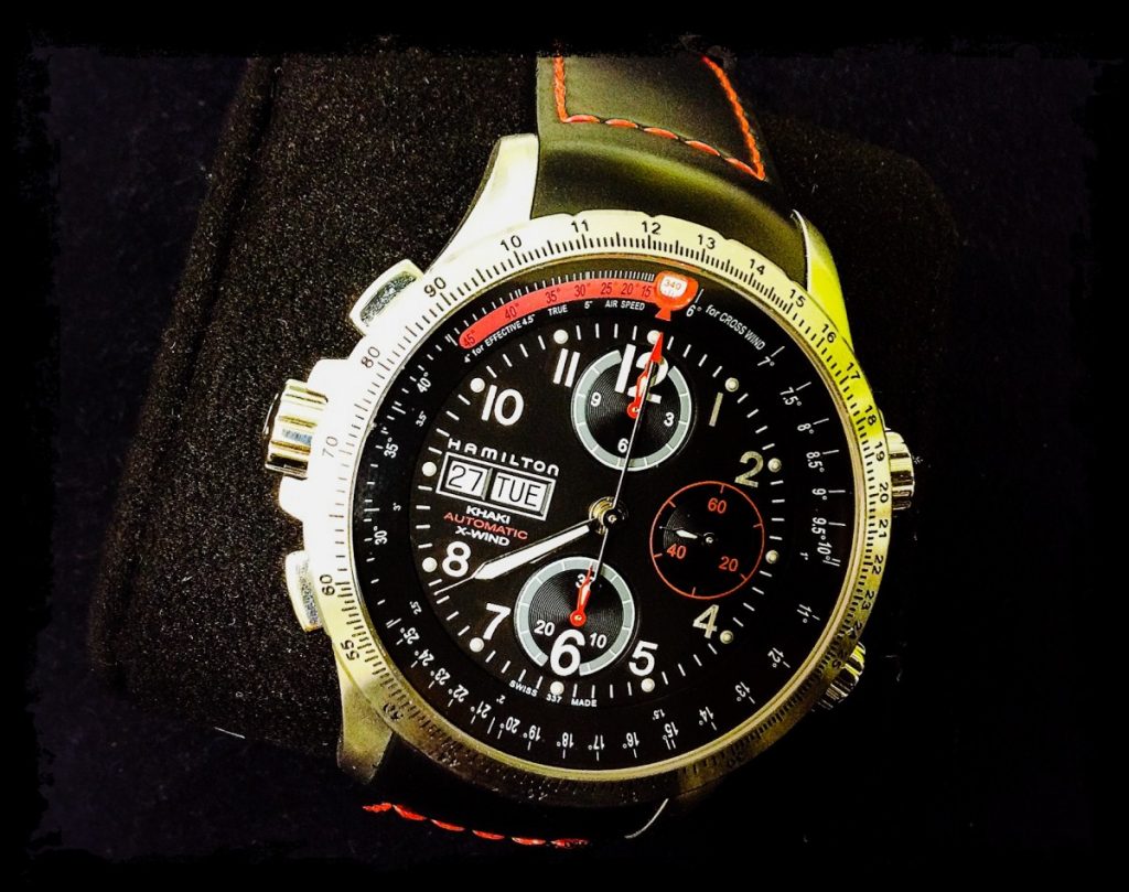ご郵送にてお預かりしましたのは、カーキ X-WIND。通常のクロノグラフ機種とは異なり、左側にクロノグラフボタンとリューズが付いていますのが特徴的なお時計でございます。インナーベゼルは風向きを、アウターベゼルは航空機の速度を表示。裏蓋は半分がスケルトン、もう半分にはクロスウィンドのグラフになっています。多機能かつ存在感大の魅力的なお時計でございます。
