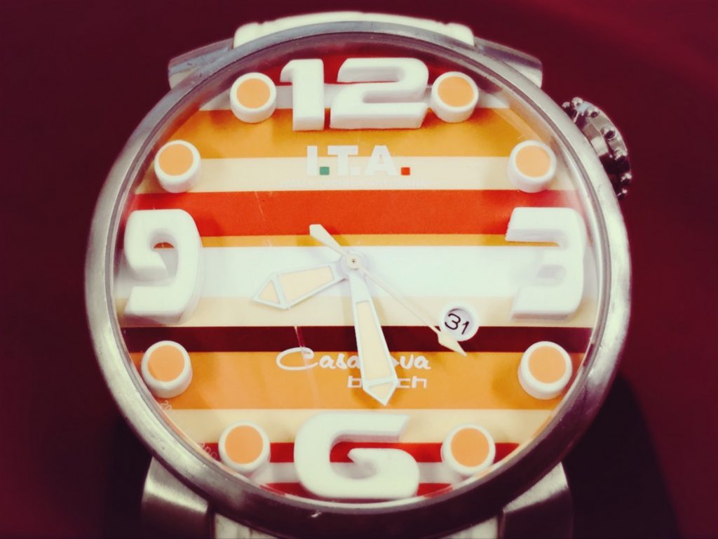 今回ご依頼いただいております、I.T.Aというブランドはイタリア発祥のブランドでございまして、大柄なケースと立体的なインデックスが特徴でございます。またカラフルな色づかいも特徴でございまして、イタリアらしい華やかさを持ったファッショナブルなお時計が人気でございます。