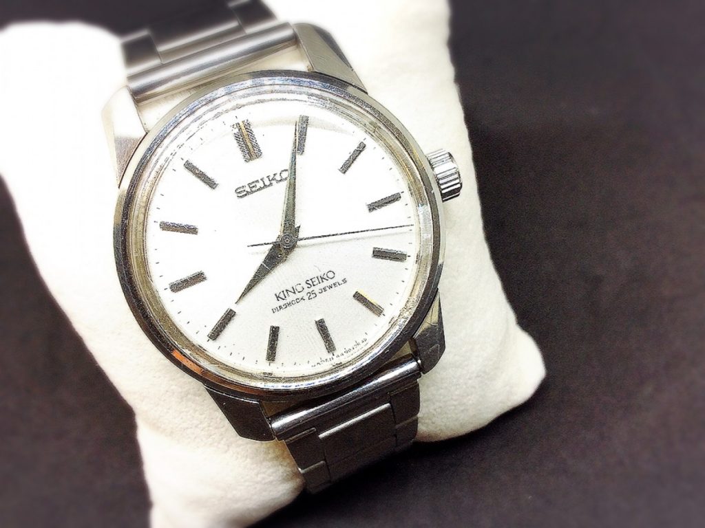 というL様のキングセイコーは、手巻き式の味わい深いお時計でございます。60年代製とのことで、当工房スタッフの誰よりも早生まれであるにもかかわらず、お預り時には時をしっかりと刻んでおりました。