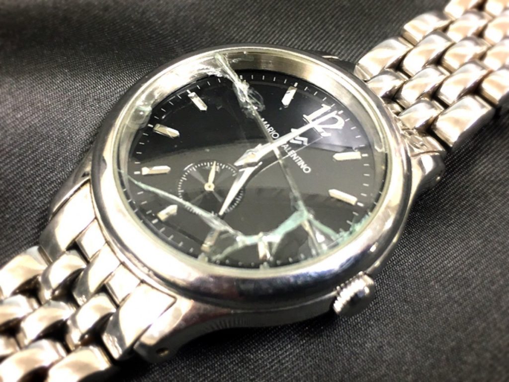 聞くところによりますと、ガラスが割れて動作しなくなってしまったとのこと、ガラスの破片が針と文字盤の間に挟まってしまっている可能性もございますし、ガラスが割れた際の衝撃で内部の部品に不具合が出た可能性もございます。