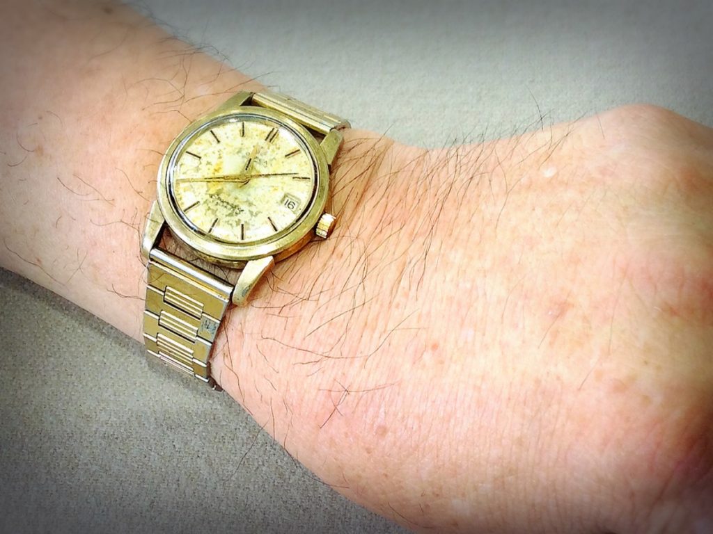 なんと、お父様のお時計だったのですね。年齢(?)は私などよりも大先輩、およそ半世紀もの歴史を持っていたことに驚きました。しばらくお仏壇に保管されていたとのことで、内部には部品にサビが多く見受けられたものの、オーバーホールでメンテナンスを行いリューズを新品交換させていただきました。ふたたびゼンマイを巻いて小気味良い音を立てながら時を刻むお時計を身につけ、感慨深そうに腕元を見つめるW様がとても印象的でございました。当ブログを昨日もご覧頂いていたと嬉しいご報告を頂戴し、記念にお写真を一枚。快く応じていただいたW様のご厚意に感謝致します。