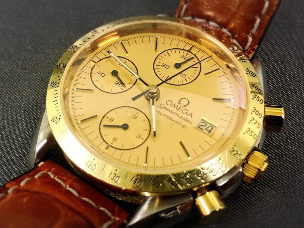 ところでこちらのお時計、ゴールドの文字盤にゴールドのベゼル、革ベルトとなっており、一見してよく見るオメガのスピードマスターのイメージとはかけ離れたものとなっておりますね。よくお見かけするスピードマスターは黒い文字盤にシルバーのベゼル、金属ベルトのもので、名前のスピードマスターの通りレーシングなイメージでございますが、こちらのお時計はドレッシーとでも言いましょうか。ラグジュアリーなイメージでございます。この度はご用命いただきありがとうございました。