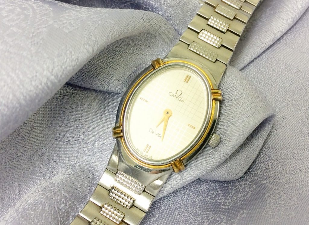 ご郵送にてお預かり致しましたのは、オメガの De Vile 。レディース向けの小ぶりな楕円形のケース、シルバーのチェック模様の文字盤にバーインデックス。ブレスレットもこだわり感じるデザインのお時計でございます。