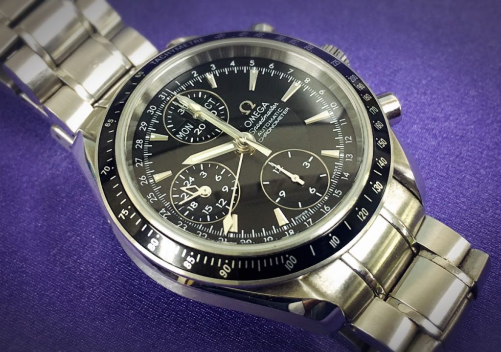 OMEGAスピードマスターをお預かりいたしました。カレンダーの針、曜日の表示が半端な位置で止まってしまうようになってしまったとのことでございます。。スタンダードなスピードマスターの機能は時刻の他に、ストップウォッチ機能がついておりますが、こちらはストップウォッチに加え、24時間計、日、月、曜日の表示が可能なモデルになっております。しかし動力の元は1つの自動巻きのお時計でございますので、内部の機構はかなり複雑になっているのでしょう。スケルトンにはなっておりませんので実際に内部の機構を見る事はできませんが。このように複数の機能を機能を持たせるためには、ゼンマイから生み出す動力が強力でなくてはいけません、同時に多数の歯車に動力を伝える必要が出て来るからでございます。実は強い動力を生み出すのは、クオーツのお時計より機械式のお時計の方が長けているのでございます。クオーツのお時計で複数の機能をもたせ、複数の針を動かす場合1つモーターではなく複数のモーターが内蔵されている場合が多くございます。時計に内蔵できるサイズの小さなモーター1つでは力不足なのでございますね。