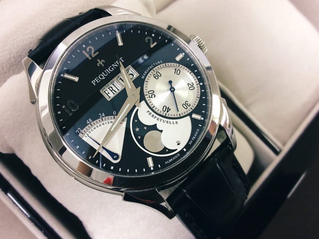 ペキニエとは、デザイナーのエミール・ペキニエがフランスのモルトーに創立した時計ブランド。こちらの「Rue Royale(リュー ロワイヤル)」は自社開発ムーブメントと複雑機構の、代表的なモデルでございます。
