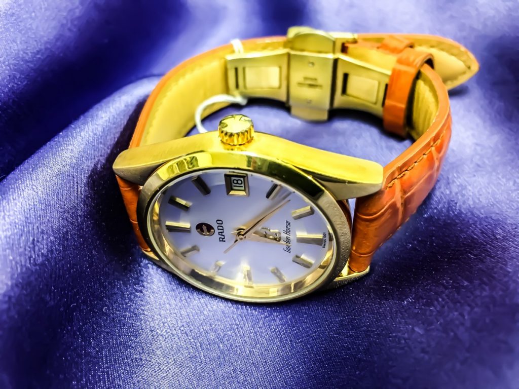 本日ご紹介致します。RADOでございます。黄金色のケースにオレンジのベルトがすごくお似合いですね!。