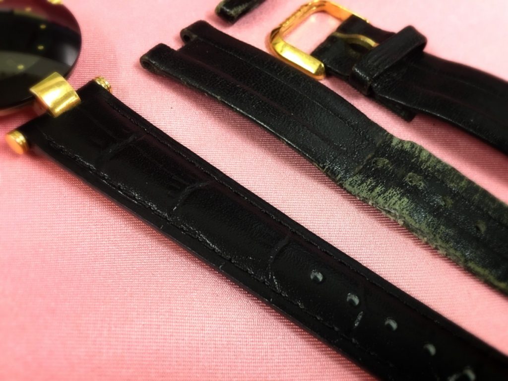 革ベルトの尾錠周りが破損してしまったため、時計が着けられなくなってしまったとのことでございました。このタイプのお時計は接続部が特殊形状ででしたので、似ているベルトをお探ししまして、接続部を加工しましてお取り付けいたしました。ベルトメーカーからは様々なサイズ・素材・色のベルトが出ておりますが、接続部が特殊な形状により、そのままでは純正ベルトでしか交換ができないお時計も多数ございます。海外製に多いと思いきや意外にも日本製のお時計にも多くございます。金属ベルトは耐久年数が長い方でございますが、革ベルトやラバーベルトについては劣化が早く、消耗品とも言えますので、純正ベルトでしか交換できない作りはコスト高でございます。