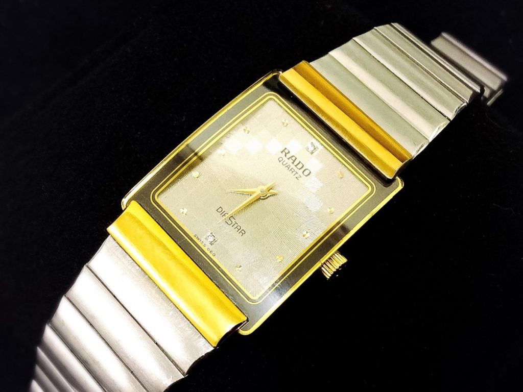 ご郵送にてお預かり致しましたのは、ラドーのDIA STAR。文字盤の模様が個性的かつ繊細なデザインで、12時と6時の位置に宝石が輝きます。ガラスにプリントされた枠により全体が締まり、とても素敵なお時計でございます。