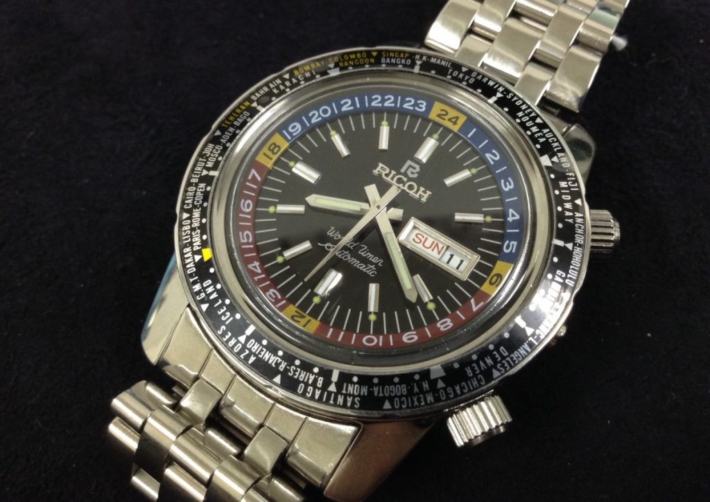 今回お預かりしたものは、RICOHのワールドタイマーウォッチでございます。たくさんの地名の書かれたベゼルとカラフルなインナーベゼルを使いまして、各地域の時刻を素早く確認する事ができる機能がこのお時計の特徴でございます。現在のクオーツにはワンプッシュで別の国の時刻を調べる機能があるものもございますが、こうのようなアナログな機能も時計の職人の知恵であり、時計自体のデザインとしても機能している、味わい深いものでございます。