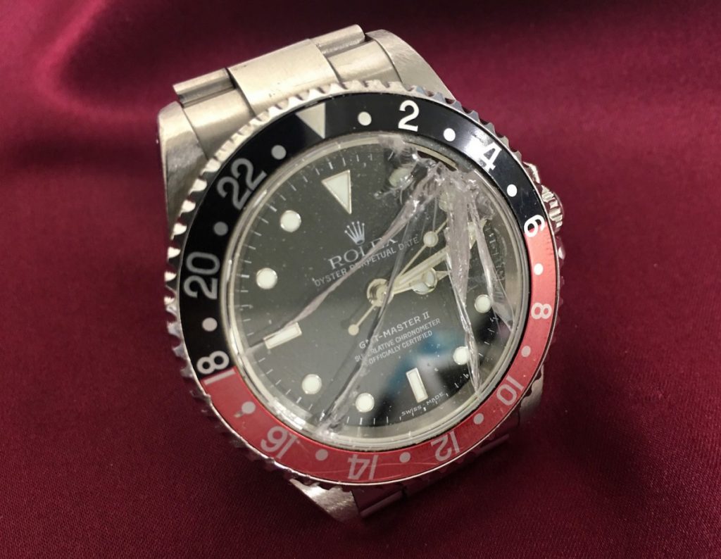 本日お客様からお預かり致しましたお時計は、15年近く愛用されているロレックスでございます。つい先日外した瞬間に落下させていしまいコンクリートの上に落としてしまい、風防が割れてしまったそうでございます。