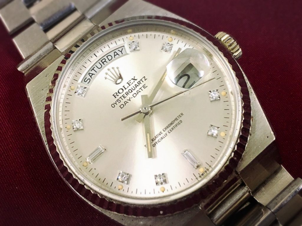 クオーツのロレックスの電池交換を承りました。今まで2500本以上のロレックスをお預かりしてまいりましたが、クオーツのロレックスのお預かり本数は数えるほどしかございません。それだけ本数が少ないという事でございます。クオーツモデルはもう10年以上前に廃盤となっており、現行で発売はされておりません。今回は電池交換のご依頼でございますので、まずはテスト用の電池にて、動作の確認をさせていただきます。もし、動作が見られなかったら、ムーブメントに不具合がある可能性が高く、オーバーホールが必要になってくるのですが、ロレックスのクオーツは、メーカー以外でオーバーホールを行う事が困難になってまいります。メーカー修理をお願いする他なくなってきてしまいますので、まずはテスト電池での動作を願うばかりでございます。