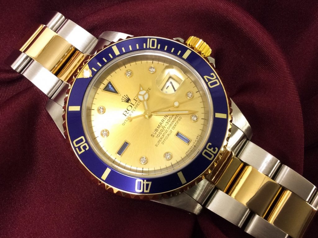 無料梱包パックにてお預かり致しましたのは、ロレックスのサブマリーナ デイト 16613SG。シャンパンの文字盤には8Pダイヤと3Pサファイアが輝き、ケースとブレスはステンレス+18Kイエローゴールドのゴージャスなお時計でございます。