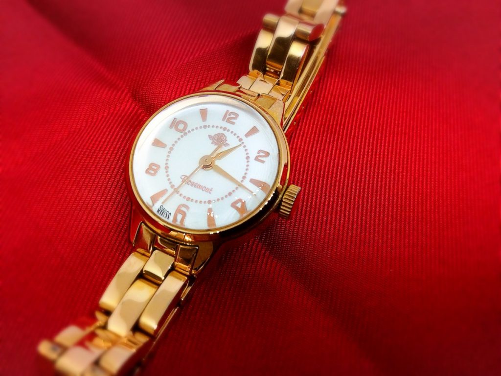 文字盤に施された薔薇のマークが可憐なロゼモン。ピンクゴールドカラーがミニマムなサイズ感でありながら存在を主張しております。スイスメイドを誇りに、非常に小さなケースに機械をおさめる繊細な造りでもあります。