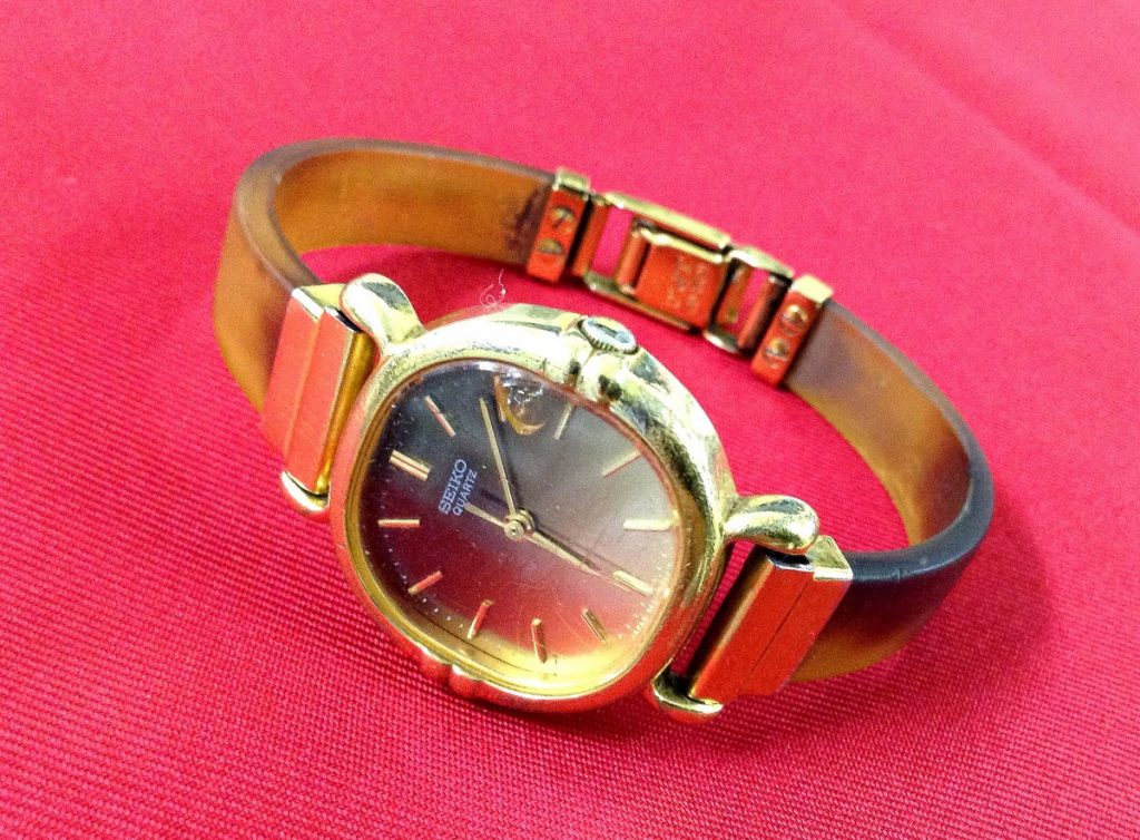 経年による退色や小さな傷は見受けられますものの、お時計を拝見するに、とても30年以上前のお時計とは思えないほど大切に扱われていたことが感じられます。そのぶん、ガラスのキズが目立ってしまいます。