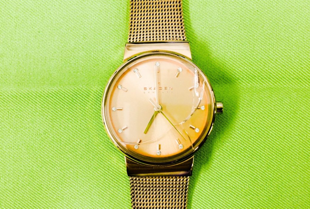 ケースからベルトに至るまで全身をピンクゴールドで統一したデザインが美しいSKAGENのお時計をお預かりいたしました。お使いいただく中での経年の劣化や汚れもほとんど見受けられない、比較的新しいお時計のように見えますが…ただ一点、ガラスに稲妻の走ったかのような大きな亀裂が入ってしまっております。ガラスが傷つく場合、このようにほぼ1本線の亀裂が大きく入るのがSKAGENのガラスの割れ方の特徴で、ほかのメーカーのお時計にはあまり見られません。ケースなどにはさほど大きな傷はみられませんので、大きな衝撃が加わったのではないのかもしれません。このような大きな亀裂になってしまい、さぞ驚かれことでしょう。早速、ガラスの交換の手配を行いましょう。