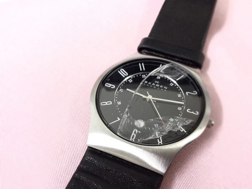 今年の春にご購入されたという、P様のスカーゲンのお時計。ガラスが大きく割れてしまっており、動いている針はむき出しの状態でございます。