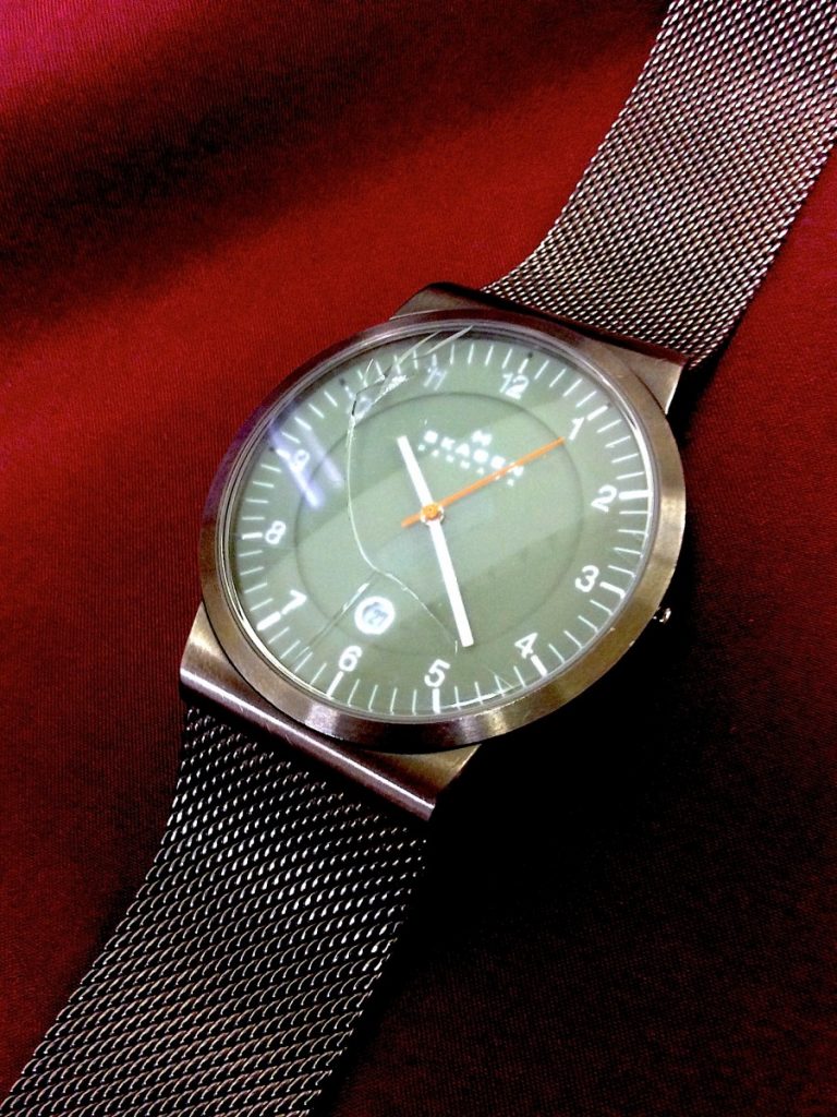 私も拝見をいたしましたが、確かに外部の衝撃が加わったような跡はございませんでした。通常、打痕と思われる跡も残るはずでございます。(あとで佐藤さんにも詳しくみて頂きます…。)珍しいケースではないかと存じますので、職人さんへも詳しく伺います。ガラス修正は行えない為、交換が必須となりますが、割れてしまった原因が不明のままではH様も安心してご使用頂けないかと存じます。できる限りではございますが、原因の追求、ご使用方法をお伝えさせて頂ければと存じます。