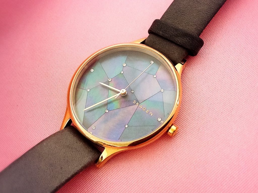 ご郵送にてお預かり致しましたのは、スカーゲンのAnita Grey Crystal。無駄がなく独創的、シャープなデザインが多い中、こちらのお時計も大変魅力的でございます。ローズゴールドのケースに、文字盤には黒蝶貝が不規則なデザインで美しく配置され、まるで星空のように石が散りばめられています。
