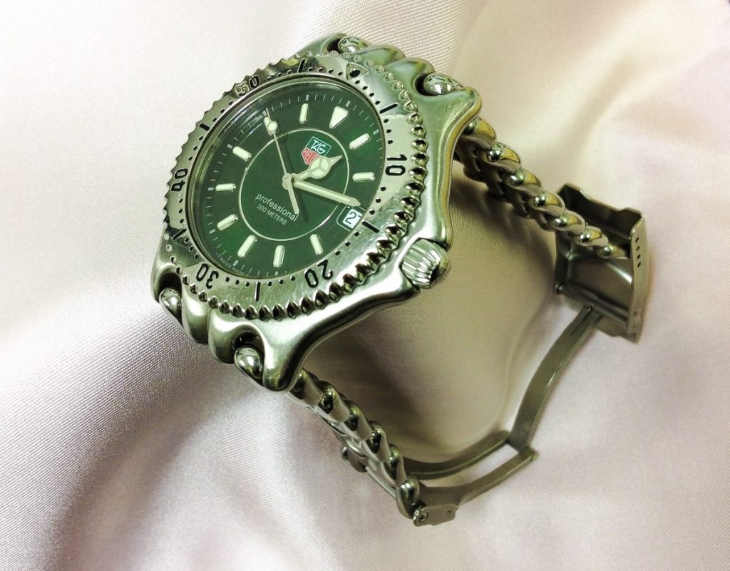 再依頼いただきました、タグホイヤーのWG111E。200mのプロフェッショナルモデルでございます。文字盤は何とも美しいグリーン。独特なデザインのメタルバンドに三つ折りのバックルで、大変魅力的なお時計でございます。
