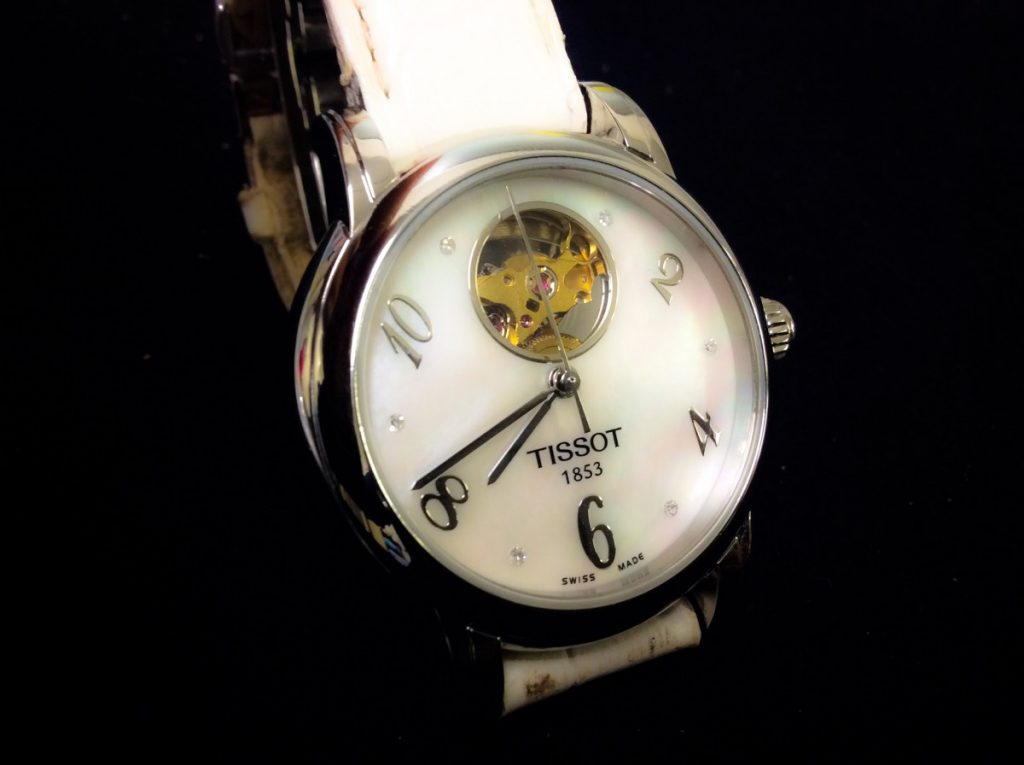 ご来店にてお預かり致しましたのは、ティソのLady Heart Automatic。美しい白蝶貝の文字盤に天然ダイヤモンドのインデックス。オープンハートで内部機械が見え、ステンレスのケースで落ち着き洗練されたデザインのお時計でございます。