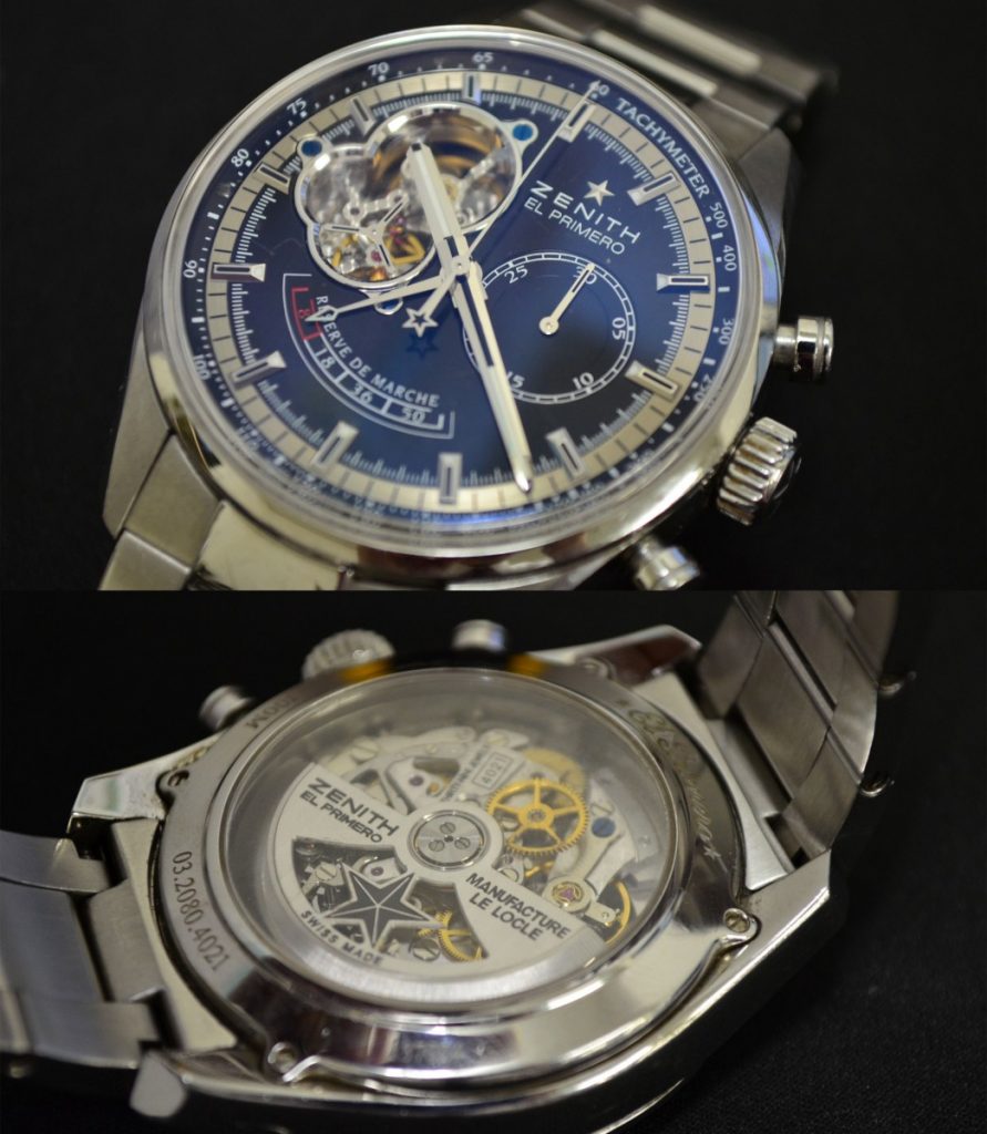 ゼニスは、どの角度から拝見しても美しいお時計でございます。お客様のお時計は文字盤にはオープン加工、裏蓋はシースルーバックで、内部のムーブメントがしっかり確認できます。ゼニス社製クロノグラフムーブメント 【エル・プリメロ】は、未だに機械式時計のクロノグラフムーブメントとしては最高傑作との評価が与えられているムーブメントです。毎時36000振動というハイビートを誇り、先代ROLEX デイトナにも搭載されていた時期があり、搭載モデルはプレミア価格で取引されています。